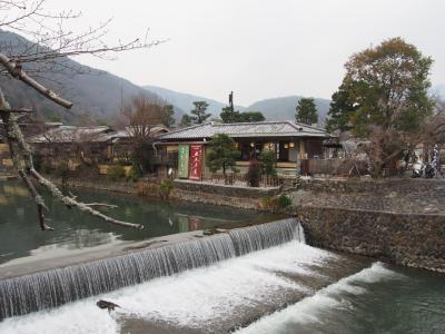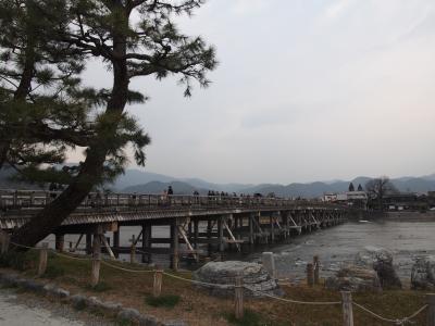お部屋で休憩したら、散策開始です。少しなんだか曇ってきた渡月橋。春には...
