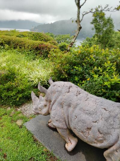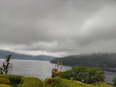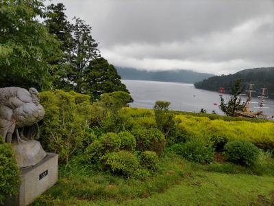 芦ノ湖がクーラー効いてて快適ななかで望めます。富士山も見えるらしいですが我が旅恒例の曇で見えず。
