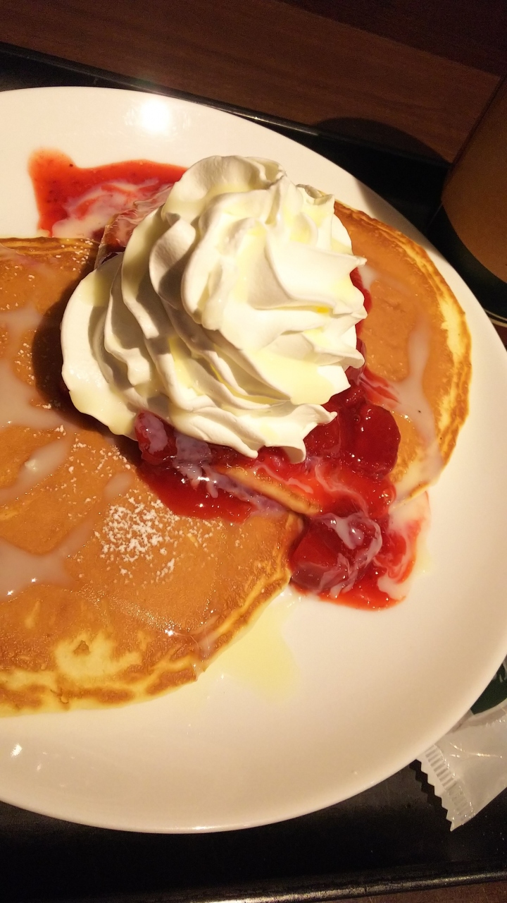 タリーズにパンケーキがあるなんて知らなかった!路上の黒板のパンケーキ、しかもいちご♪にひかれて、どんなのかわからず注文。ホイップクリームのっててなかなか本格的ではないですか♪くどい?気持ち悪いとかならない?と心配しましたが無事でした。超長居には不向きかなという小中規模な店舗でした。