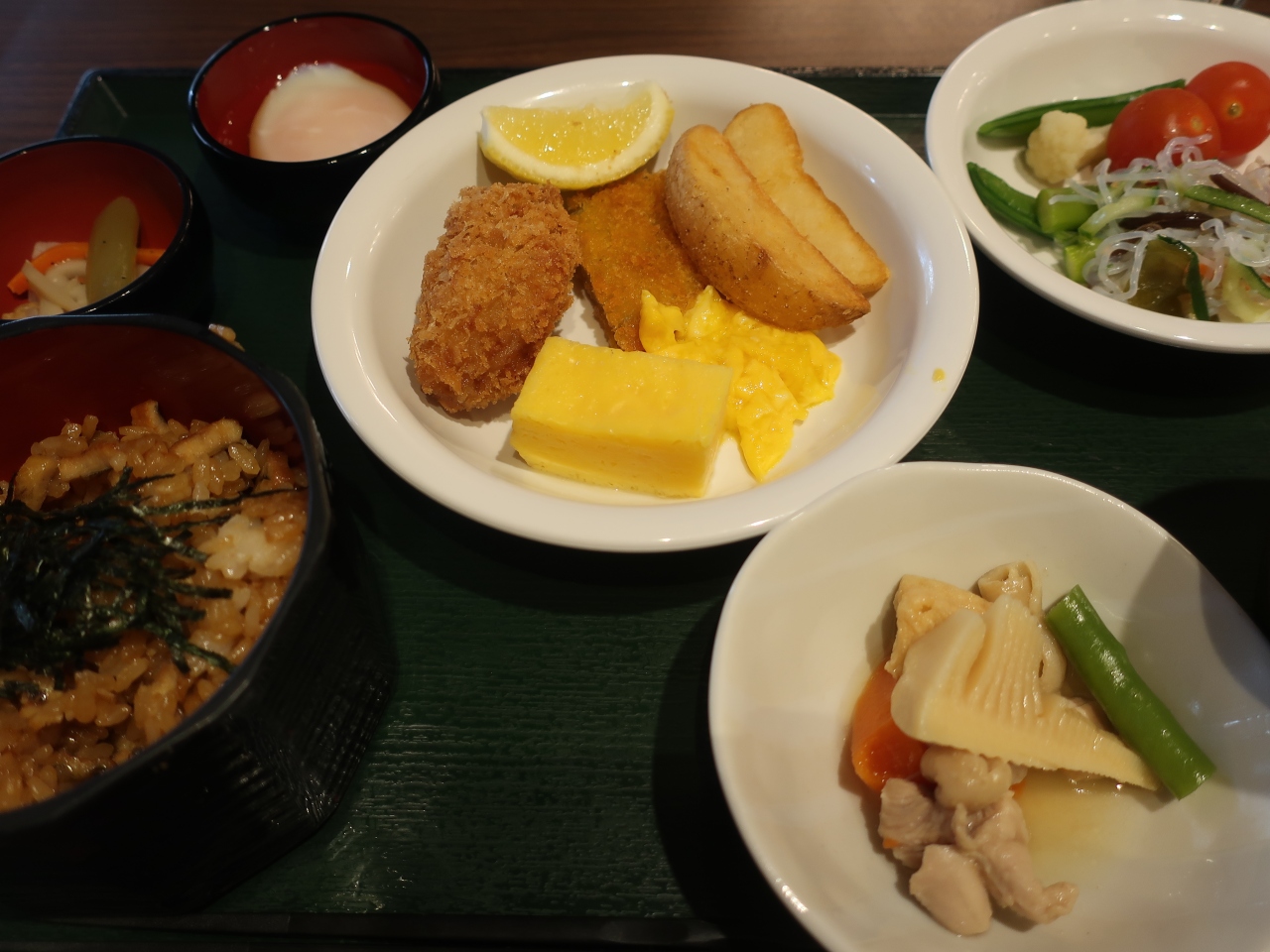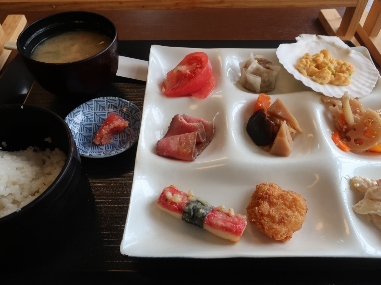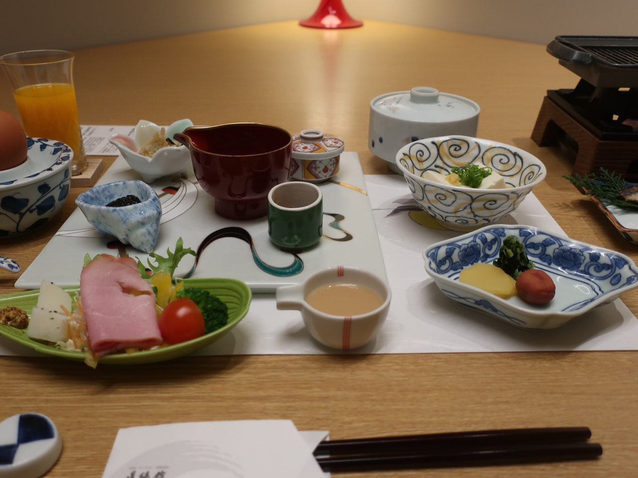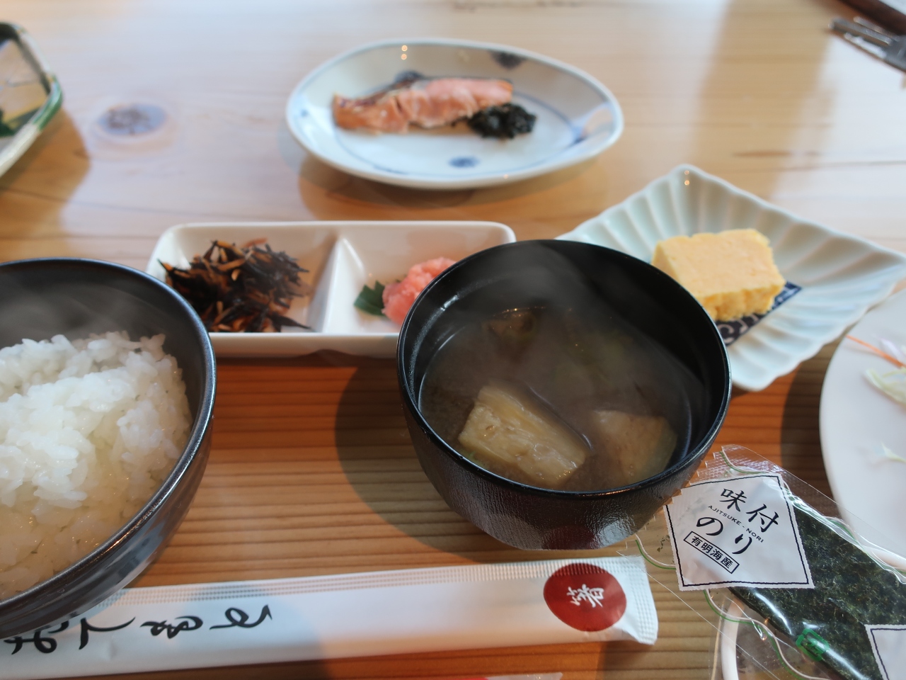 朝食は五穀米、白米、おかゆから選べました。ごはん、みそ汁ともおかわりできます。食事会場は一組ずつ仕切られているので、安心です。