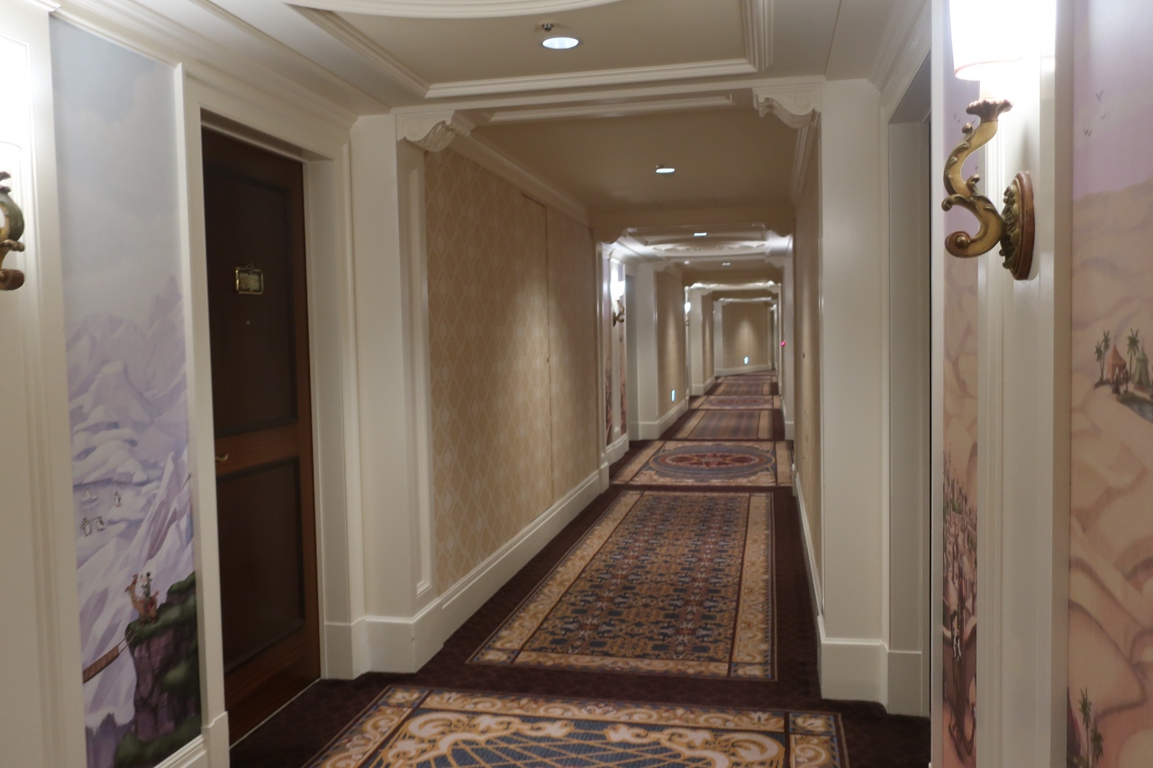 初めてディズニーホテルに宿泊しました。客室へ着くまでに、廊下の壁などディズニーキャラクターの姿を見つけることができ、楽しめます。
