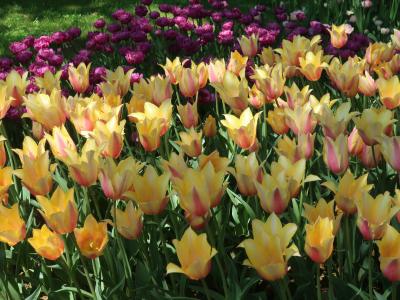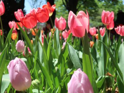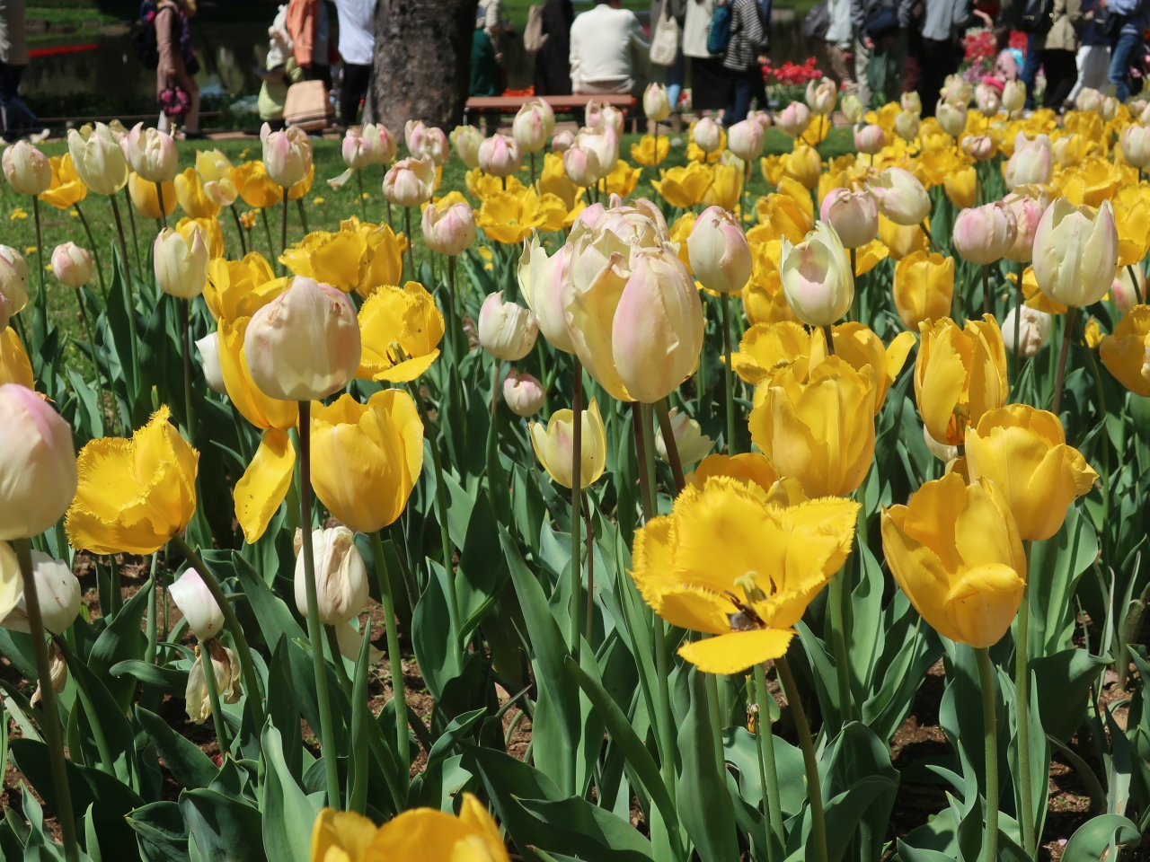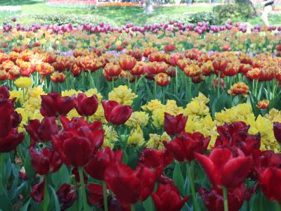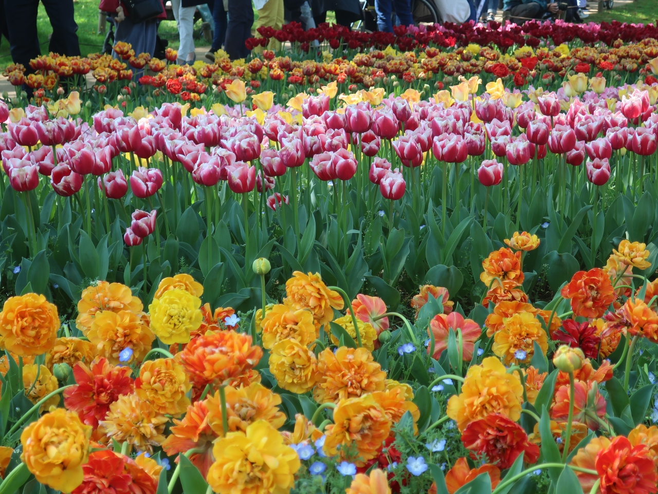 お目当てのチューリップは渓流広場周辺で、広い公園の中央辺り、さらに歩きました。チューリップガーデンには、これもチューリップというような八重やユリのような花など、色々な種類が植えられていて、華やかでした。