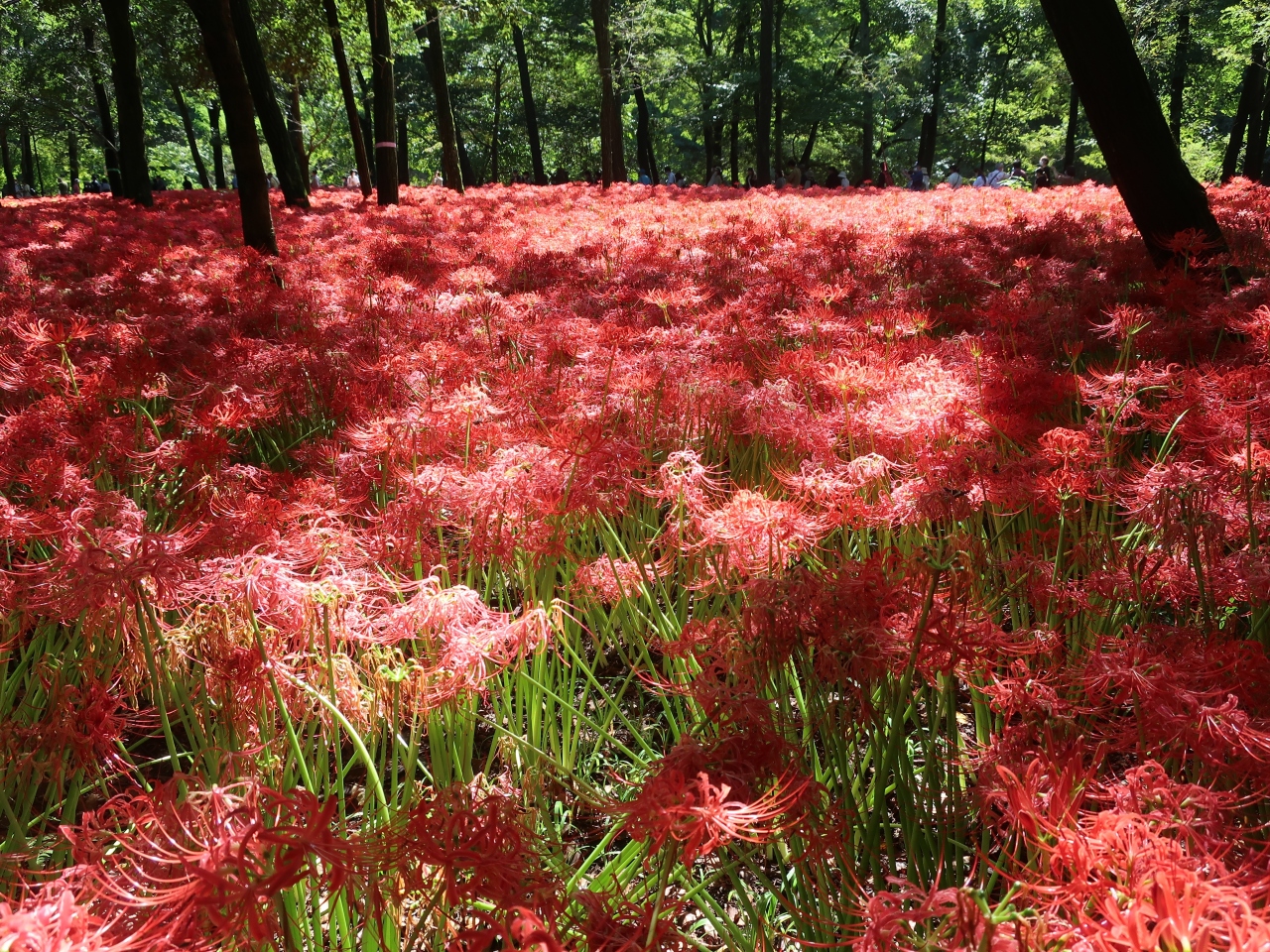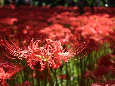 駅のポスターを見て行ってみたいと思っていました。高麗川に囲まれた平地に真っ赤な曼殊沙華が一面に咲いていました。思っていた以上に広範囲で見事です。延々と広がる真っ赤な花に緑の茎や木々も美しく何枚も写真を撮りたくなります。