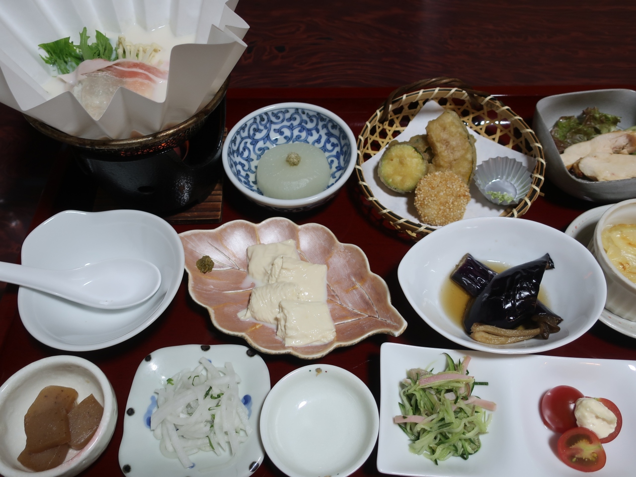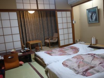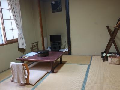 和室6畳、トイレ洗面所が共同の部屋に宿泊しました。夕食は部屋食でした。野菜多めの家庭的なお食事、おいしくいただきました。お風呂は内湯が2つ、露天風呂が1つで、貸し切り制となっていました。貸し切り札がかかっていなければ、何度も入ることができます。45分を目安にということでしたが、3つ全てのお風呂がふさがっていて入れないということもなく、ゆっくりつかることができました。