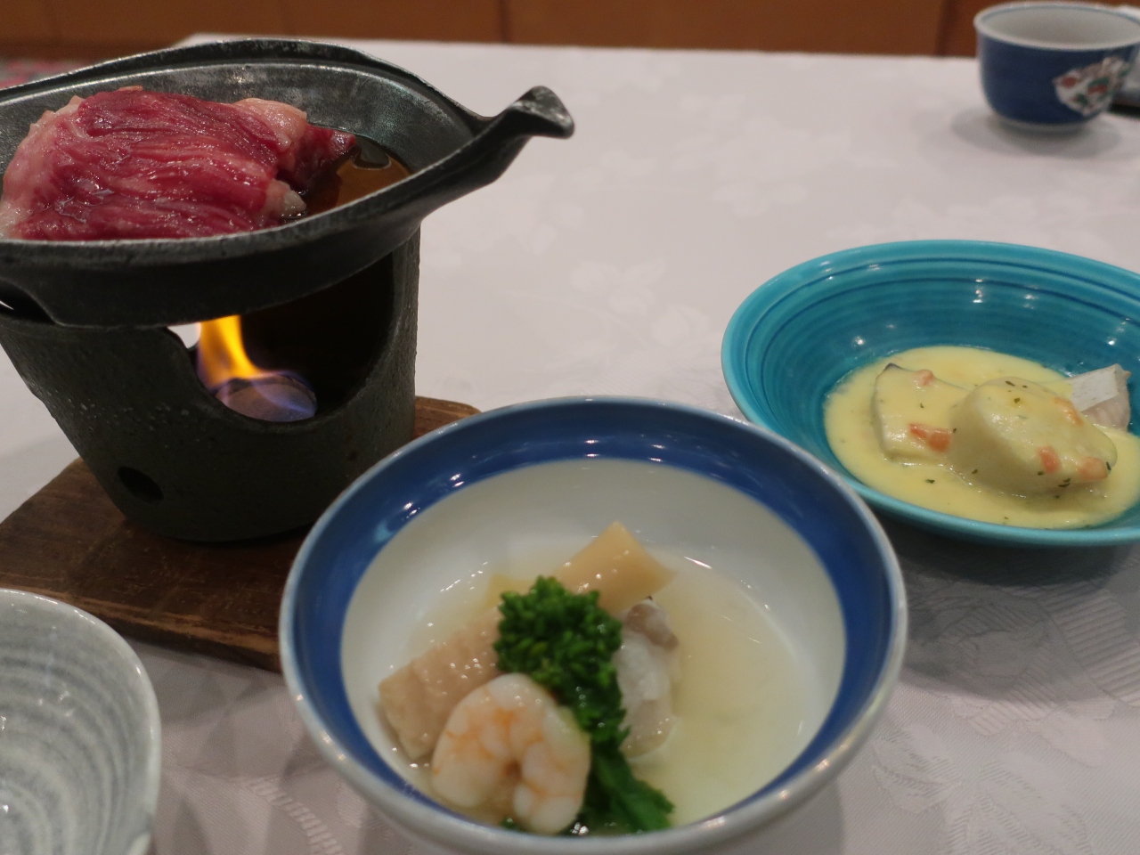 食事は量も多くおいしかったです。到着時間が遅れたためかもしれませんが、冷めていたのが少し残念でした。でも芋煮など温かくおいしくいただきました。