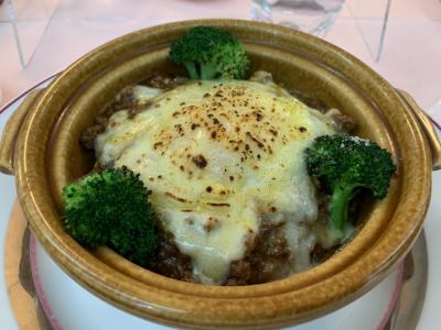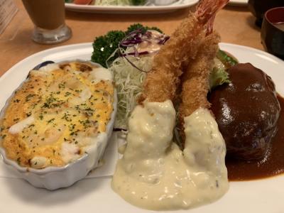 いつも満席でランチ時間は必ず並んでいます。今回はグラタン、エビフライ、ハンバーグの3品セットにしました。ライスとドリンクがついて1,950円でした。