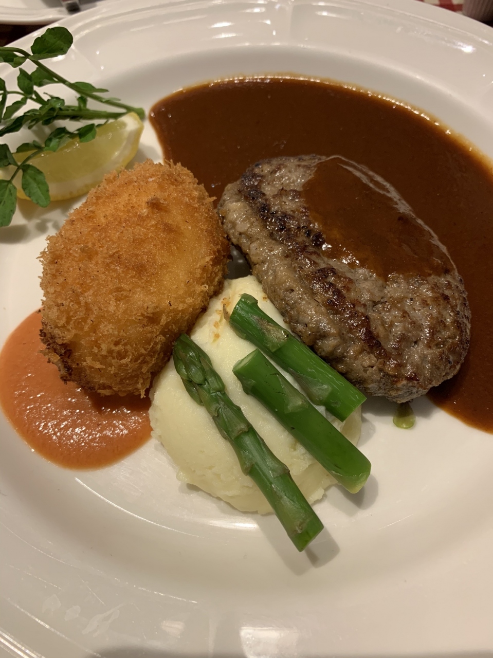 自家製カニクリームコロッケとハンバーグセットを注文。ハンバーグは120gと180gを選べます。全体的に普通に美味しかったです。