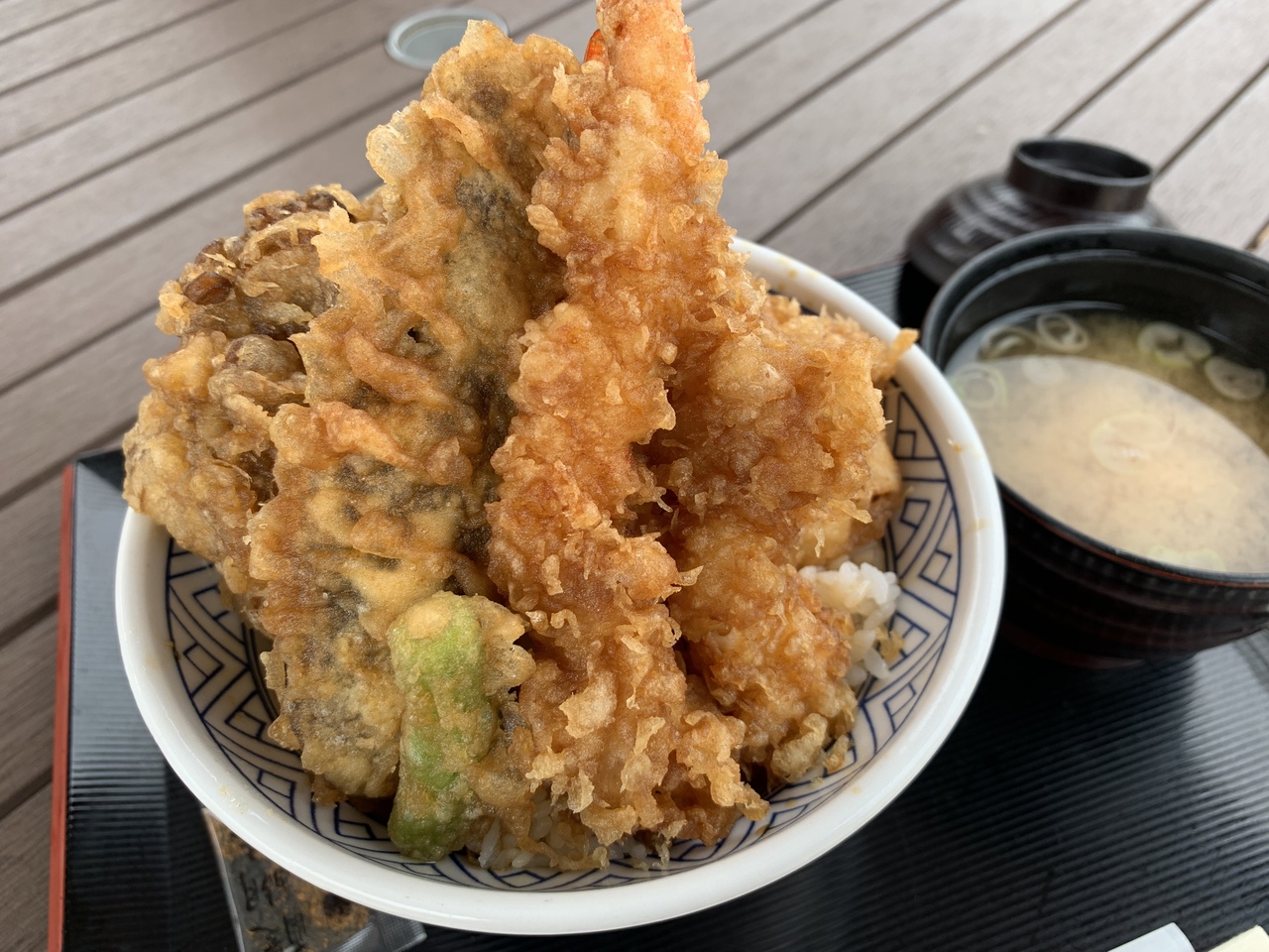 海老二本、舞茸、海苔、ししとう、ナスの天丼を食べてみました。値段は一番安かったです。