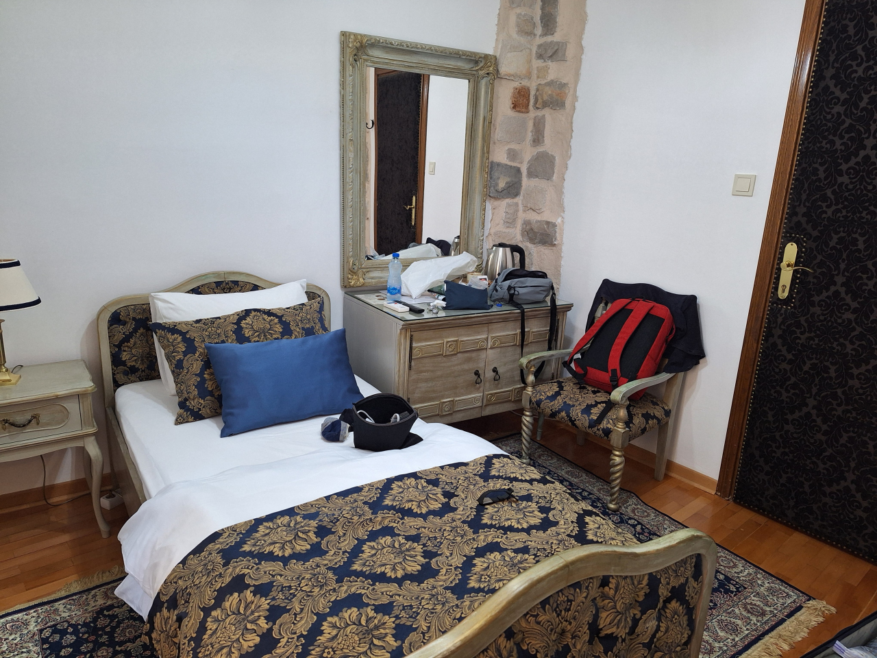 コトルの狭い旧市街の中にあり、周囲はレストランやカフェが密集しているが、夜は比較的静かだった。観光にも食事に便利で、オーナーも優しく、一人旅の人にもお勧めできる。城壁の散策や、ペラストのツアーに参加するにも便利。
