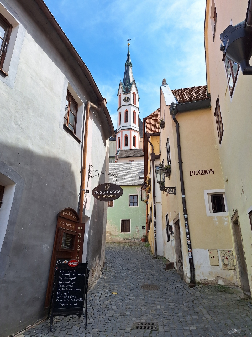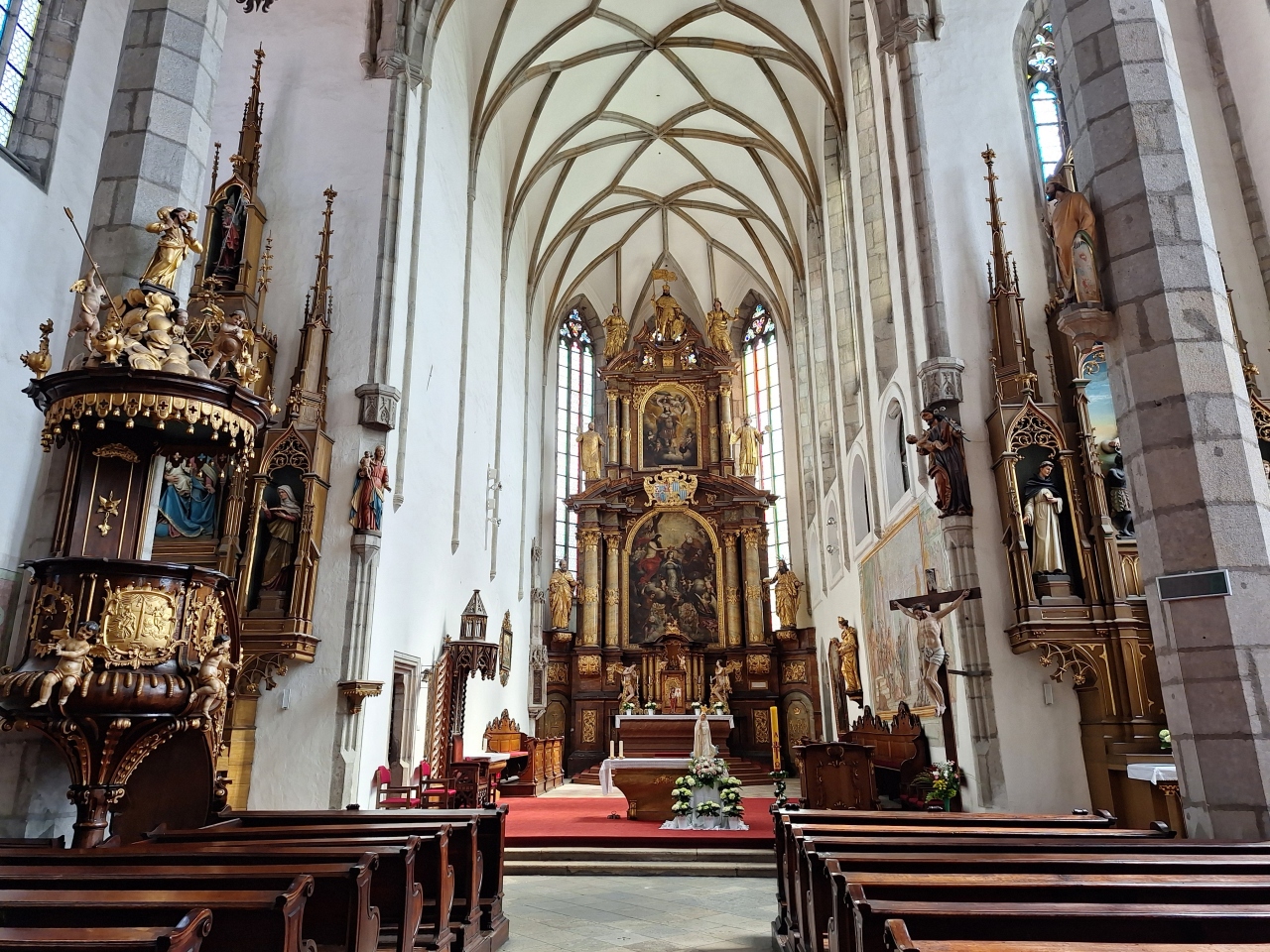 チェスキークルムロフのスヴォルノスト広場から徒歩3分ほど坂道を上がったところにある、ゴシック様式の教会。祭壇には聖ヴィートと聖母マリアが描かれ、古いパイプオルガンもある。ひときわ高い尖塔は、チェスキークルムロフ城からもよく見え、街のシンボリックなアイコンとして見どころが多いが、素朴な教会ゆえ、観光客はほとんどいない。