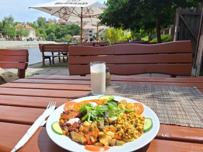 チェスキークルムロフ城へ向かう途中の橋のたもと、川べりにある、おそらくランチ営業実のカフェ。日本語が堪能な男性店員がいる。チェコは肉、ビール、ポテト(クネドリーキ)、ハム・・・と言った料理が続くので、ここでいただいたベジタリアンプレートとバナナラッシーは実にやさしい字味わいだった。