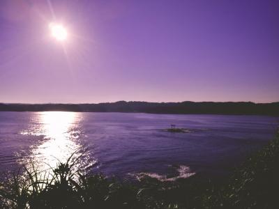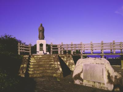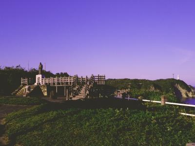 勝浦と言えば、タンタンメン、かき氷、新鮮な魚料理が有名で、観光となれば海中展望塔か遠見崎神社が有名だが、個人的に絶景はこの八幡岬公園。家康の側室だったお万の方の像が立つ、勝浦湾、平和の鳥居、太平洋が一望できる絶景スポット。霞んだ向こう側には勝浦の海中展望塔も臨むことが出来る。夕日スポットだが、夏の18時ごろにはたまたま一人しかおらず、絶景を独り占めできた。