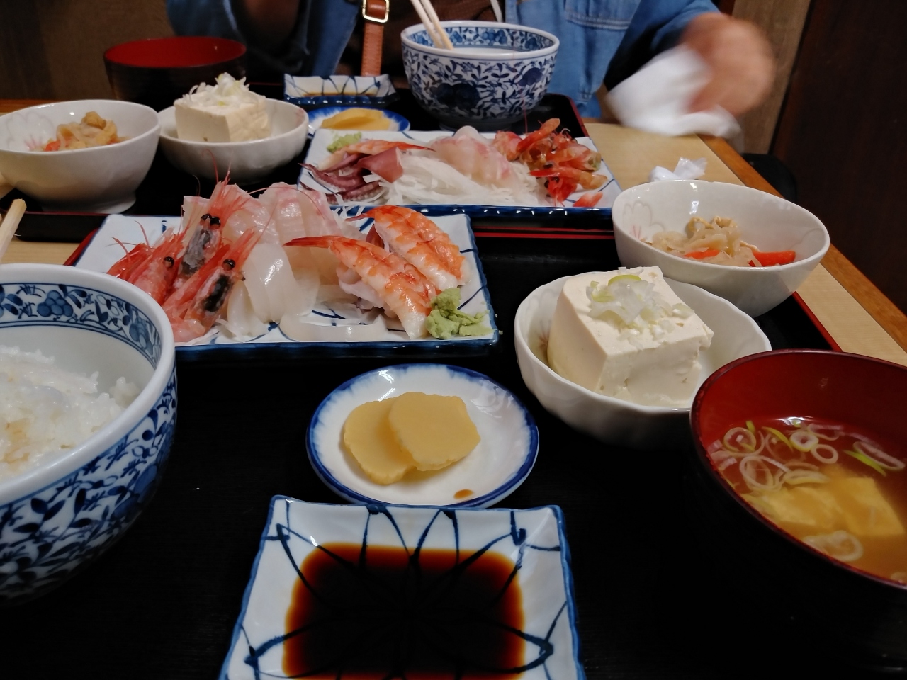 両津港近くのレンタカー屋で車を返して、1時間ほどフェリーの出航まであったのでこちらを訪問。新鮮な魚介とたっぷりのサービス定食で有名な店だが、混雑時にはやや店員さんも殺伐としてくるので、出来れば混雑時を外した方が無難。刺身定食は大変美味だった。
