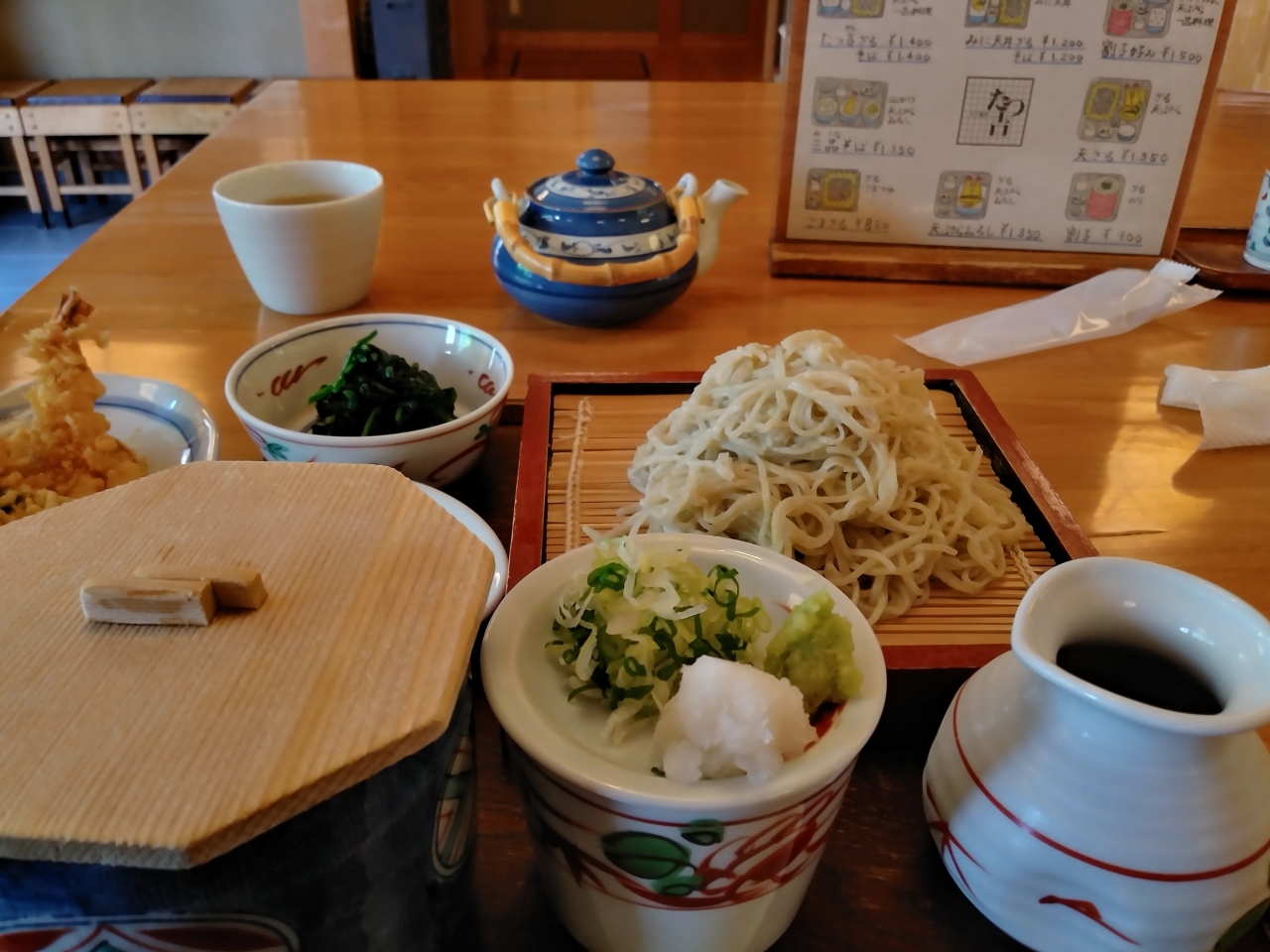 昼、夜とも営業時間は比較的短いが、地元の人でにぎわう蕎麦屋。自家製の蕎麦は香はそれほど強くないが、舌触りもよく風味は抜群。セットでついてくる鮭ご飯が美味。割子や天ざる等もあり、ランチメニューは意外と豊富。