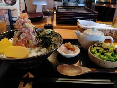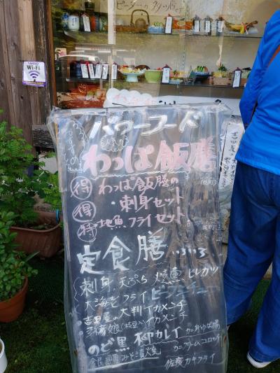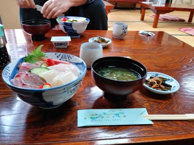 宿根木へ行く途中、小木港に立ち寄って訪問。評判のよい海鮮割烹としてガイドブックにも載っている有名店。入った時は自分たちだけだったが、出るころには満席になった。鮑の甘煮丼、海鮮丼が有名で、海鮮丼はどの魚もぷりぷり。隣の魚屋で注文して2階席で食べるスタイル。