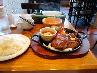 JR三ノ宮駅で電車を待つ間に食べられるランチ、ということで、隣のミントに入っているこちらへ。さすがに2000円以下で神戸牛、とはいかないが、ハンバーグとステーキが入ったランチでスープ、サラダ付きでこの値段はお値打ち。ハンバーグのソースは4種類から選べる。