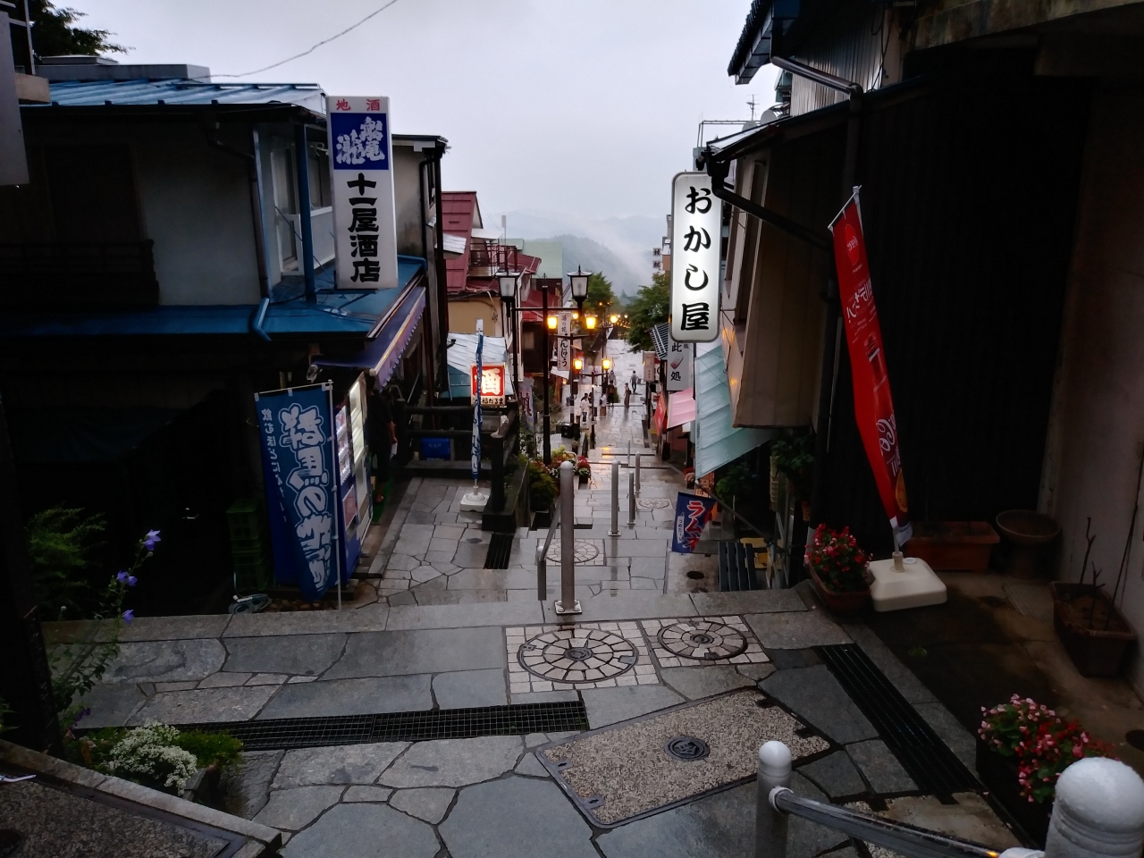 旅行一週間前に予約。1泊2食付きで約8000円、それに夕食はアルコール飲み放題ということを考えると驚異のコスパ。食事は十分満足できるレベルで、温泉も露天と源泉かけ流しの風呂があることを考えると、非常にお値打ちのホテルだと思う。石段街までは歩いて10分ほど。