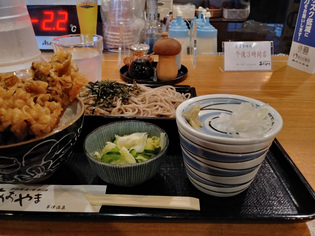 観光客向けに評判のいい蕎麦屋とのことだったので入ったが、可もなく不可もなく、といった感じだった。舞茸天丼ミニと蕎麦のミニのセットで1100円。観光地価格と思えば何ということはないが、正直割高に感じる。味は悪くはなかった。