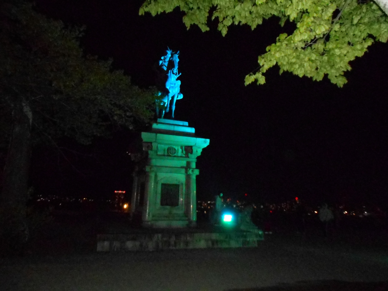 昼間に見る時間はなく、夜、ライトアップされた政宗公の像を見に、国際センター駅から徒歩で訪問。本丸跡までの道はかなり坂が急だが、何より怖いのが街灯があまりに少なく、けもの道を歩くようなコースになること。頂上のカップルやグループはもれなく車か自転車できており、徒歩の訪問は注意が必要。一応、駅付近のビジホまできれいに見えるので、眺めはよい。