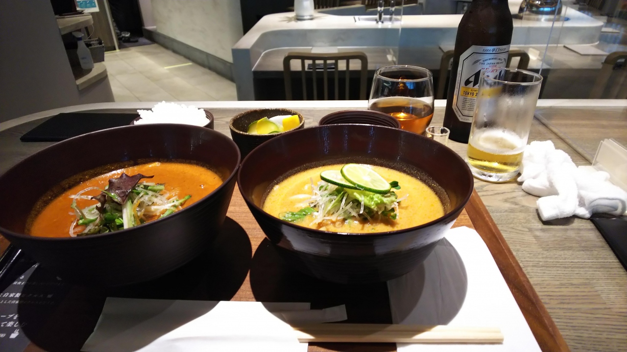 羽田空港内で見つけて気になっていたカレーうどん専門店。小瓶だがビールも置いてある。この日はハーフアンドハーフをオーダー。トマトカレーと冷やしカレーで,どちらもコクのあるスパイスが入った程よい辛さ。ご飯を入れてカレーライスにしても絶品。惜しいのは価格が相当に高いこと。