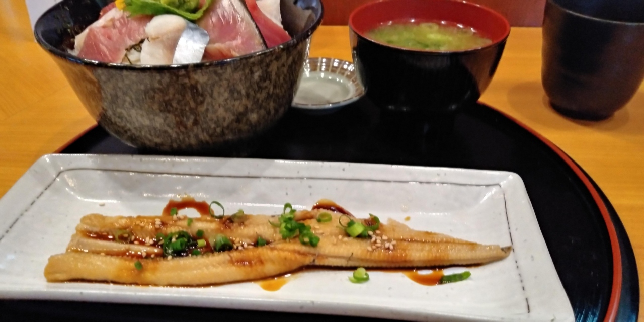 競争が激しい八重洲北口のお店の中で,ランチ時も常に満席の海鮮料理の店。昼はミックスフライや生姜焼き定食などもあるが,アナゴ一本乗せ海鮮丼を注文。アナゴはしっかりタレが絡み,海鮮丼のネタも新鮮そのものだった。