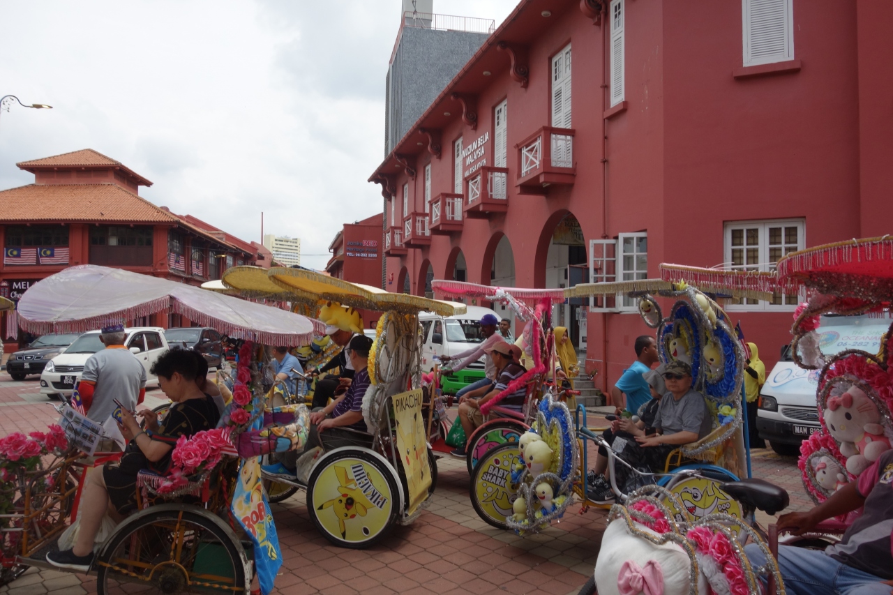 派手にデコレーションした自転車で,ペナン島と並んでマラッカ名物の足として有名。キティ,ピカチュウ,ドラえもんの3巨頭が人気。料金は交渉性だが,1時間50リンギット前後が相場なのではないかと思う。夜も走るが,暑い日中の観光の足として使うのがベスト。