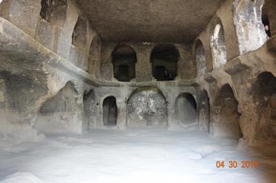 ヒッタイト人から逃れた?とされる人々が住んでいたらしい洞窟の中の住居。最盛期は2万人の人々が生活していたという迷宮です。照明がつけられているので探索は容易ですが、光が差し込まない奥まで通路が広がり、こんな発狂しそうな場所でよく生活で来たなあ、と感動します。