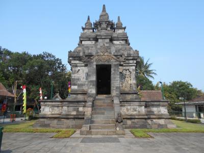 ボロブドゥール遺跡周辺からムンドゥ寺院を目指して自転車をこぐと、わずか数分でたどり着ける辞意。高さは10mほどで、こじんまりとした作りの中に精巧なレリーフや特徴的な窓などが織り込まれた建物だが、いかんせん小さな寺院一つなので、見どころにはかける。すぐ行けるけど、特に見なくても後悔はしないかもしれない。