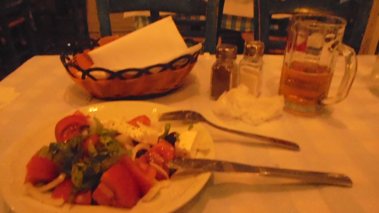 グリークサラダ、ワインハーフボトル、ラムチョップとサガナキを注文。