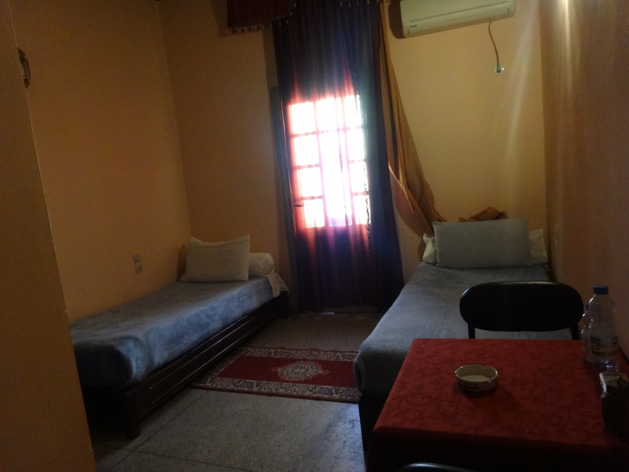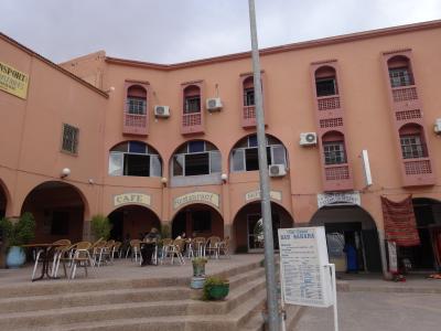 ワルザザートの広場に面したホテル。CTMのバスターミナルから徒歩圏内です。設備は古く、なんとなく日本の学校か病院のような雰囲気の造りです。部屋は広々としていますが、いたって質素でエアコン・TVがあり冷蔵庫はありません。狭いけれどバルコニーつきで広場を眺められます。バスルームも広いものの古いです。お湯は問題なく出ますが、水圧が弱く頭や体を洗うのに普段より時間がかかります。