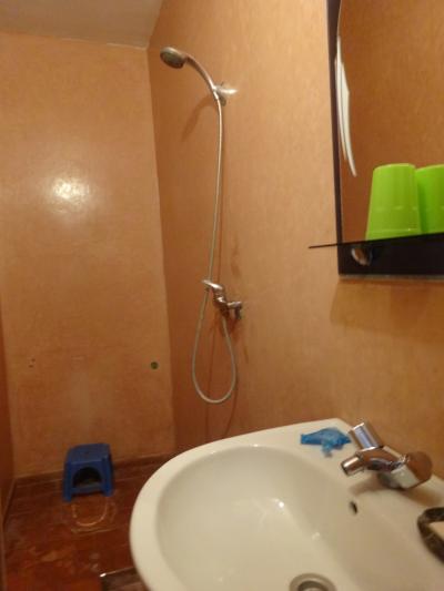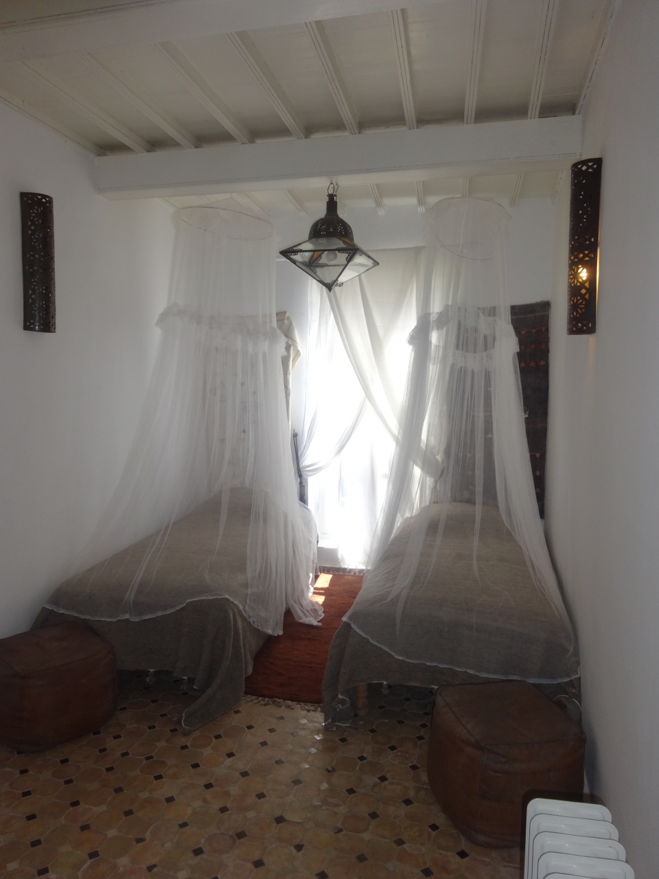 でも部屋に入ると別世界。シンプルでナチュラルな装飾にときめきました。部屋は3階でメディナの路地に面してました。窓からは陽光が入り室内はとても明るく、路地で遊んでいる子供たちを眺めるのが楽しかったです。バスルームは古いですが清潔に保たれており、トイレの流れはかなり良好。固定式のシャワーと洗面台は少々使いにくく、アメニティは石鹸のみです。室内ではwifiは繋がりません。