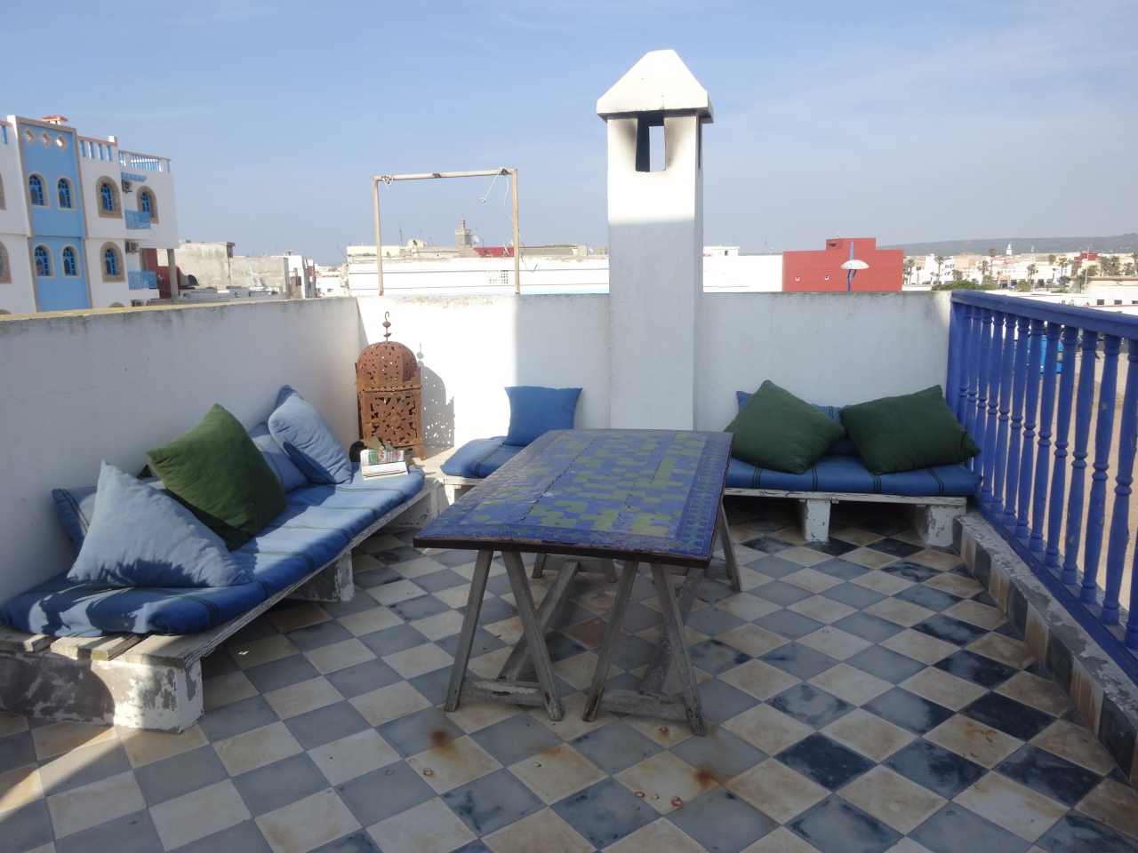 エッサウィラのメディナ内にあるリヤド。メディナの北東の角にある小さな入口から入ると1本道で辿り着くのでわかりやすい場所にあります。中庭には緑が溢れ、4匹のカメが自由に歩き回っていて癒されます。リヤドの外観はとにかく古い!外壁のペンキが剥がれ、共用テラスのソファやクッションは色あせてます。