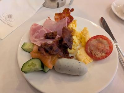 レストランは高級感があり、夜は素敵なディナーがいただけそうです。朝食はビュッフェで、品数は豊富です。4泊中、メニューはほぼ同じでしたが、白ソーセージがとても美味しく、毎日いただきました。また、朝からフルサイズのケーキが並ぶので、テンションが上がります(いつでもあるわけではないようですが)。- 旅行時期