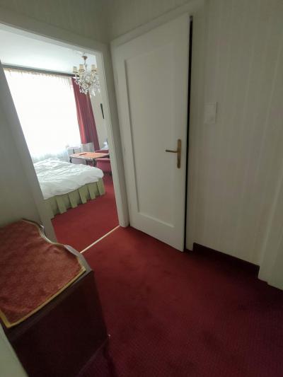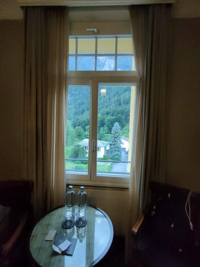 ホテルは、インターラーケンオスト駅から歩いて7、8分、メインストリートのヘーエ通りに面しています。外観は重厚でクラシカル、内装も雰囲気があります。部屋からは、山の景色と、近くのヘーエマットに降りてくるパラグライダーがよく見えました。