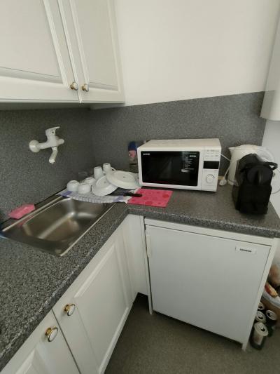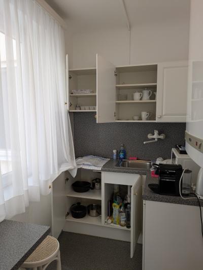 キッチンには、冷蔵庫、電子レンジ、ガスコンロ、電気ポットなどがコンパクトに設置されています。調理器具(フライパン、鍋、包丁、ボウルなど)、食器類(平皿、深皿、グラス、カップなど)、カトラリー類も十分に用意されていました。コーヒーマシンもあり、カプセルは毎日補充されました。