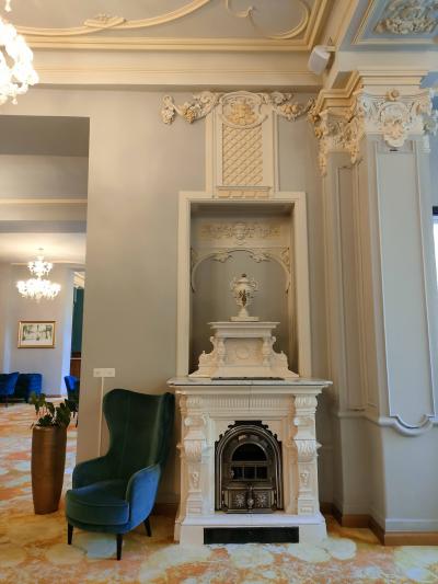 歴史あるホテルだけあってフロントやロビーは格式高く、スタッフの服装や対応もきっちりしています。エレベーターは螺旋階段の中央を貫くタイプですが、ガタガタ揺れながらゆっくり進むものではなく、ガラス張りで高速です。