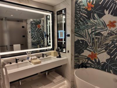 バスタブの横の壁は、タイルのモザイク画です。