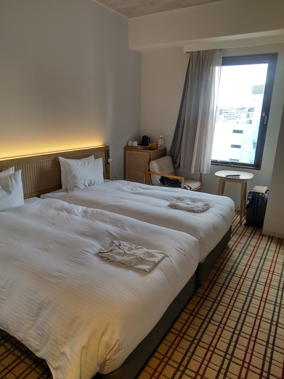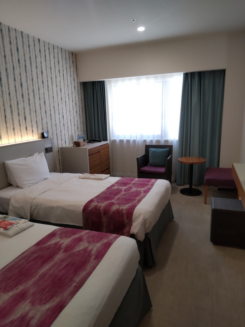 客室は、スーツケースを開けるのにも、2人で動き回るのにも十分な広さがありますが、クローゼットは無くてハンガーラックと抽斗がひとつ。ゆとりのあるビジネスホテルと言った感じでしょうか。
