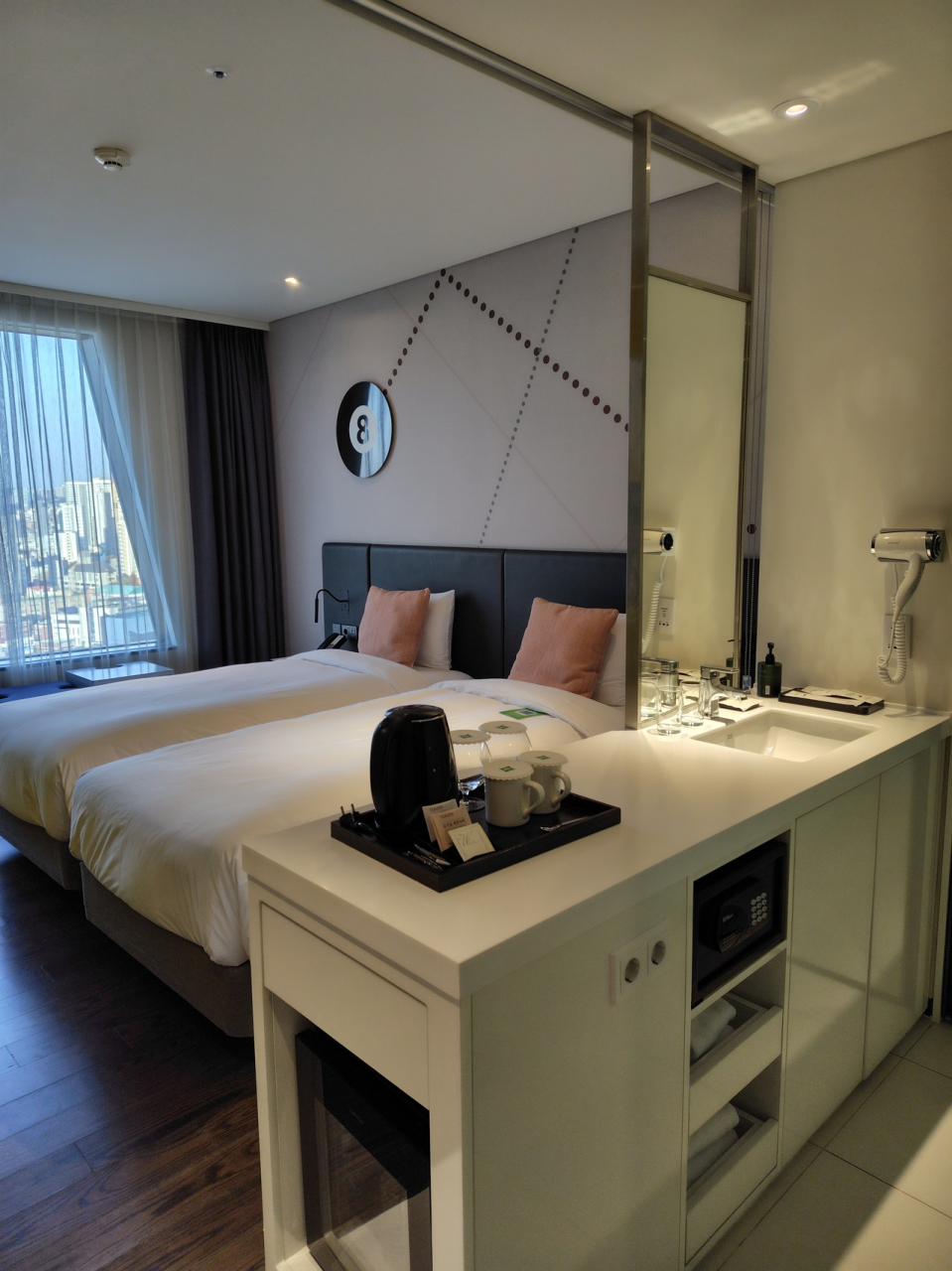 仁川国際空港の周りの広い埋め立て地に、ポツンポツンと建っているホテルのひとつです。私たちは、パラダイスシティのカジノに行くために宿泊しました。