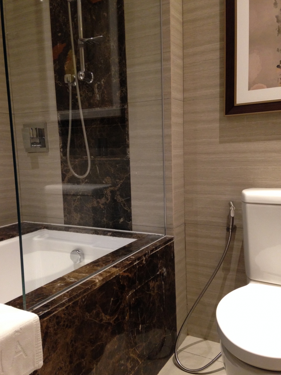 何より凄いのがバスタブ!ジャグジーこそ付いていませんが、大きくて、湯水の蛇口が滝のようになっていて、ハンドシャワーも付いていて豪華。シャワールームも別にあります。
