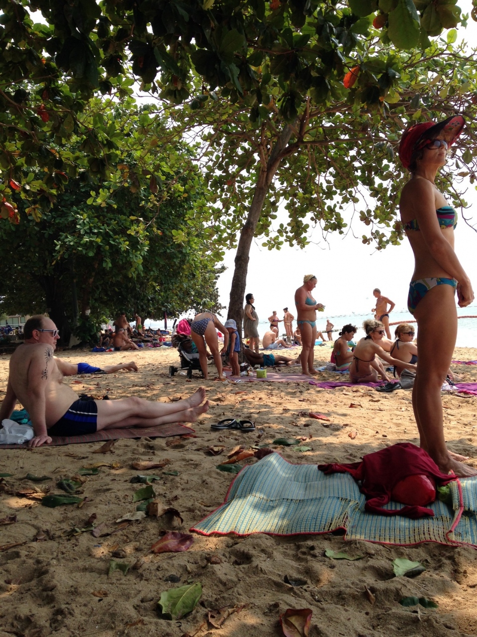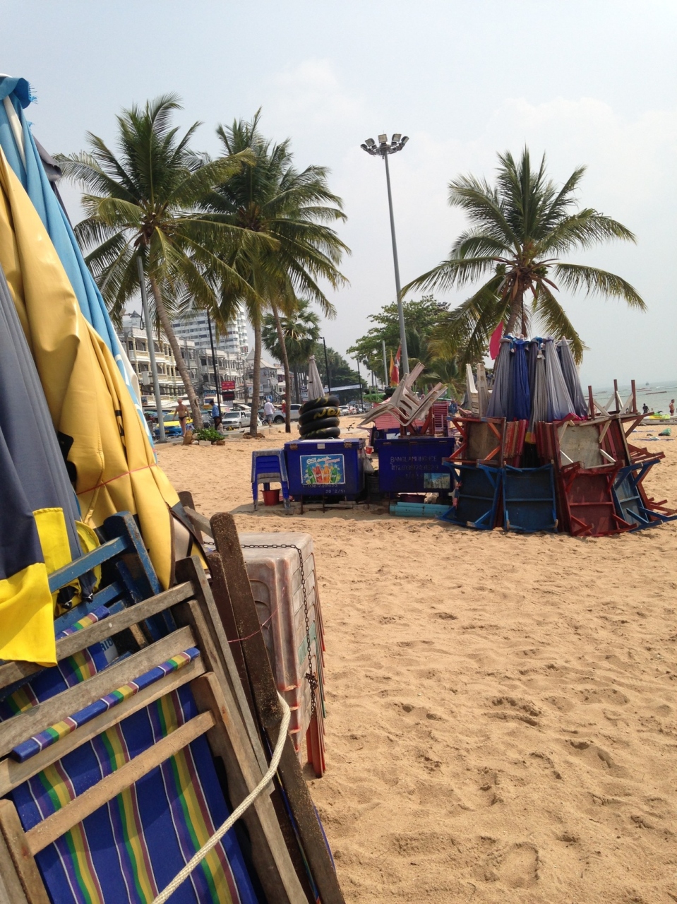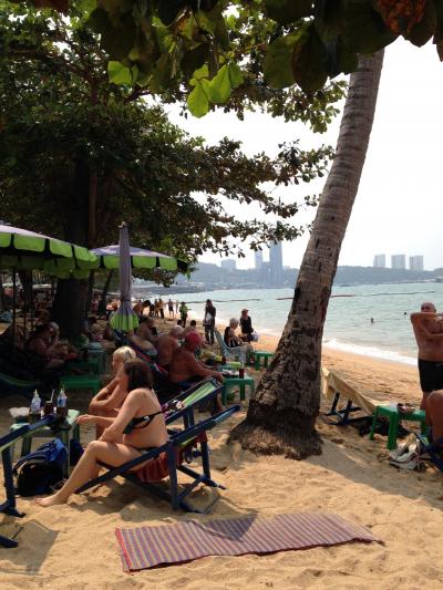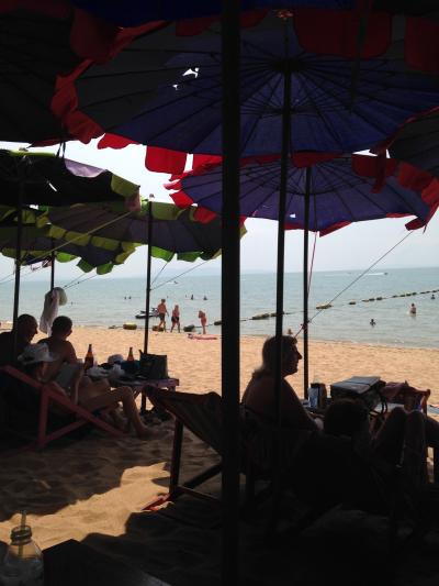 ビーチ自体は砂が綺麗で豊富です。水は濁っていてパタヤビーチと似たり寄ったり。ビーチにはパラソルが張り巡らされ、その下のチェアー(テーブルを含め)は1人40~50バーツで借りられます。ただし、毎週かどうかはわかりませんが、水曜日にはパラソル・チェアーがビーチ全域で休業でした。