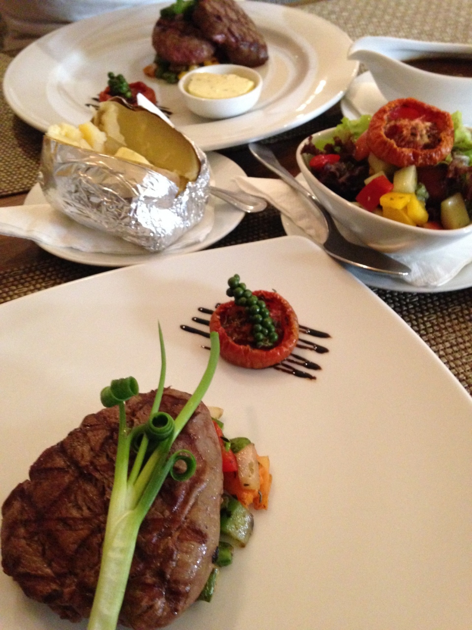 私は一番小さい150g、主人は150×2の300gを頼みました。付け合わせ(ポテト、サラダ、スープその他沢山ありました)とソース(これも沢山!)を選べます。