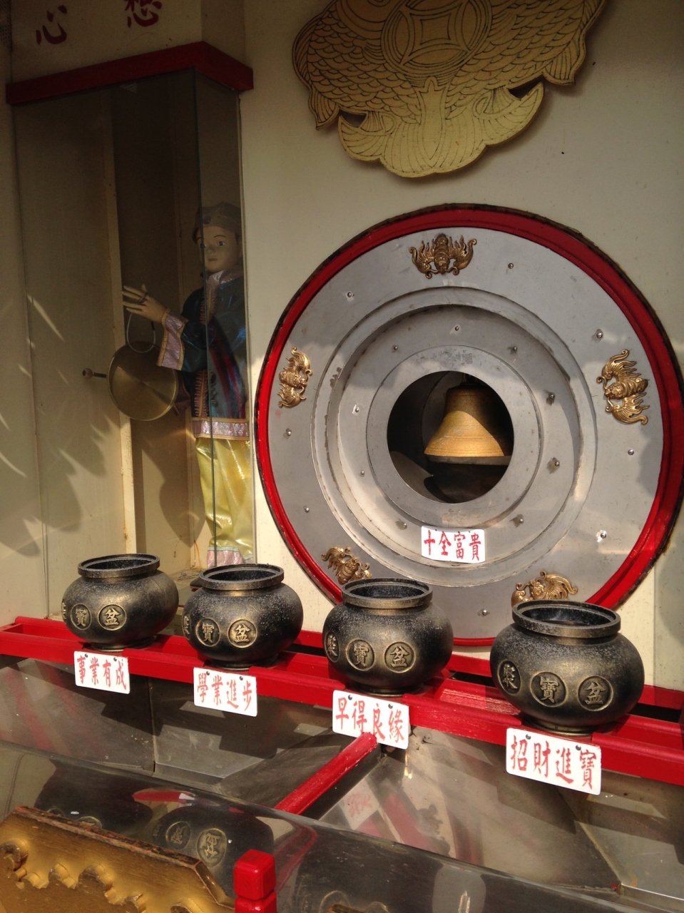 が、元帝廟に面白い賽銭箱があったので、ついつい4~5回硬貨を投げてしまいました。学業、良縁、健康、、等の壺が5つと、その上に「全部」みたいな鐘があって、鐘に当てると両側の人形が太鼓と銅鑼を鳴らして動くのでした。(笑)