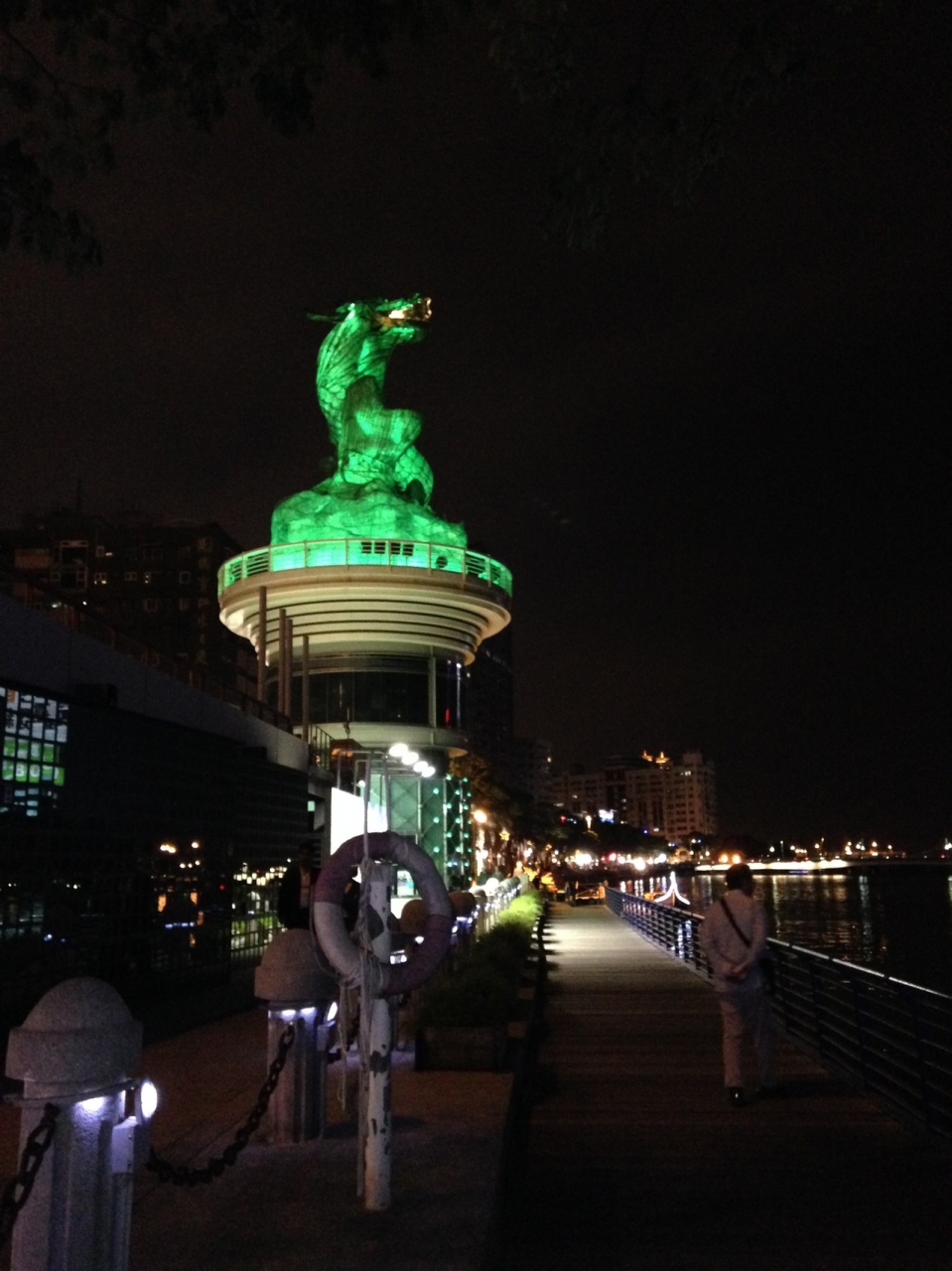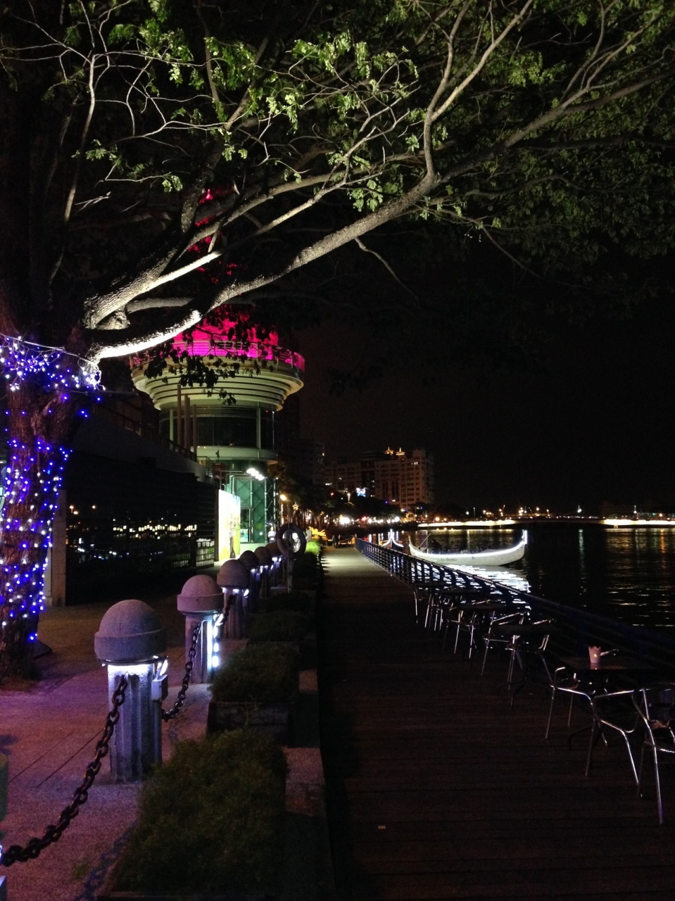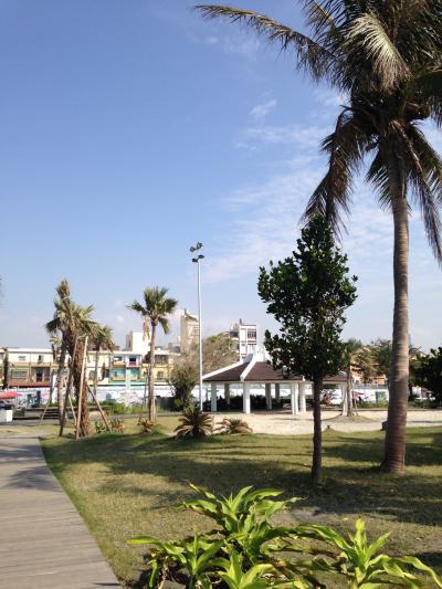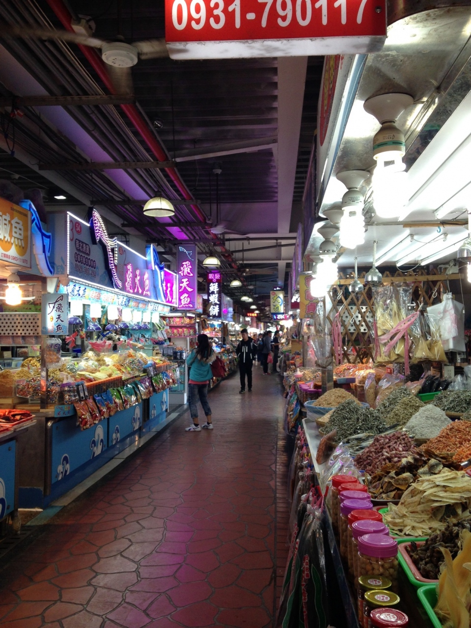 海鮮料理店を冷やかしながら廟前路を通り抜け、公園から海を眺め(サーファーがたくさんいました)、公園に沿って南下すると、カラフルな旗津道酒店が目に入り、その1階が観光海産市場になっていました。売っている物は、乾燥ホタテやのしイカ等の乾物。何処の店も殆ど同じですが、カラフルな照明で通り抜けるだけでも楽しかったです。