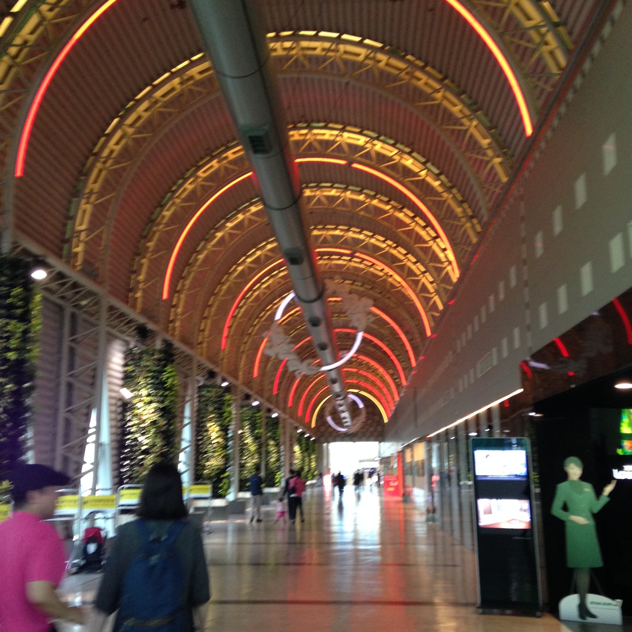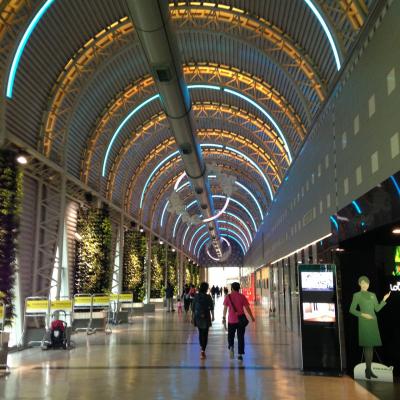 高雄の地下鉄(MRT)の中心 美麗島駅が美しいことに対抗しているのか、ライトアップしていて、美しい空港です。(写真参照)