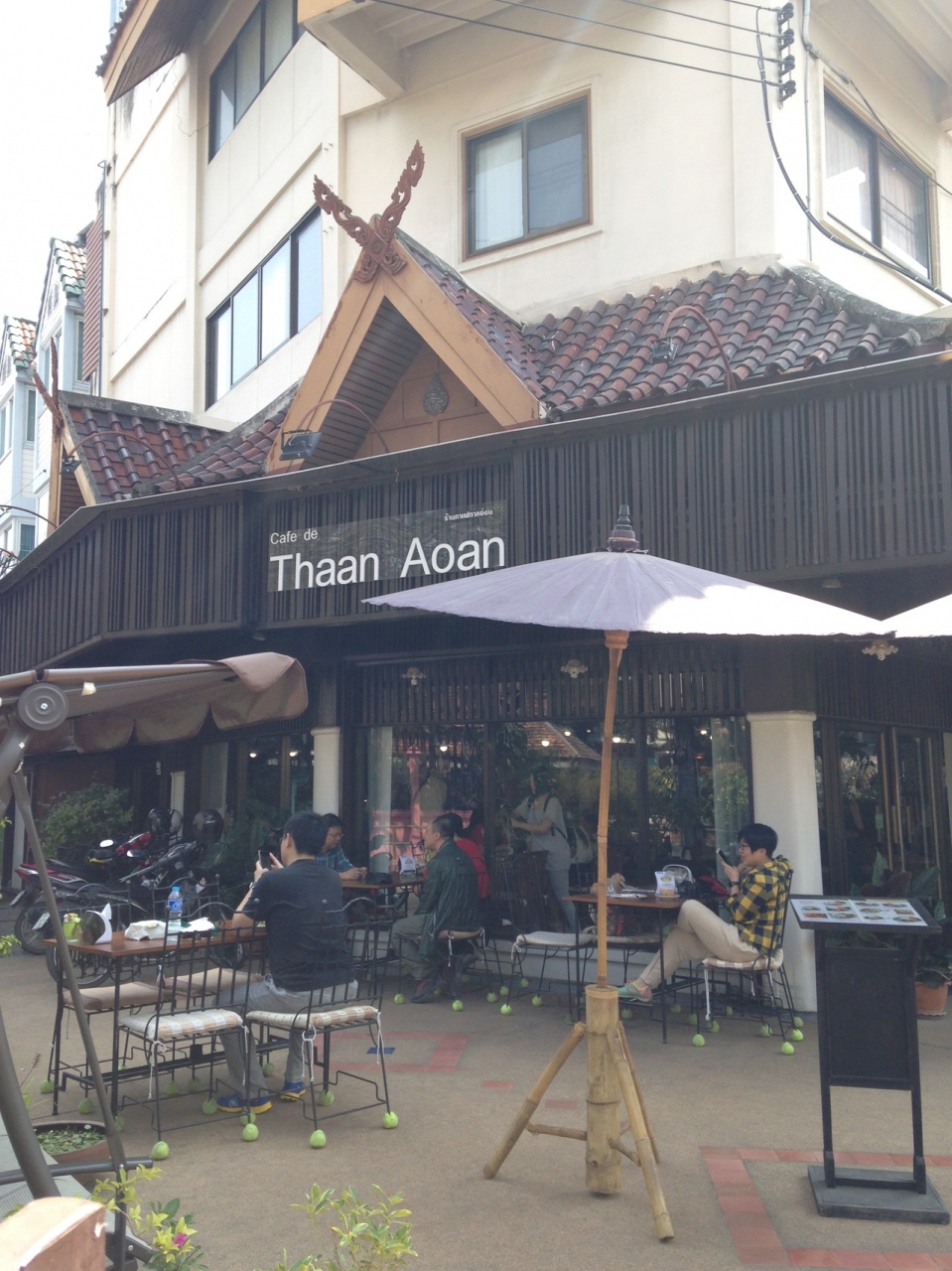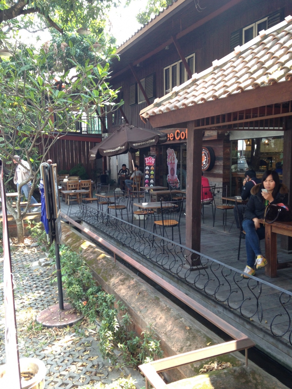 チェンマイ門から北に向かいラチァマンカ通りとの交差点にあります。ここの一角は寺院ですが、あとの3カ所はそれぞれ大きなカフェになっていて、モダンな雰囲気の場所です。