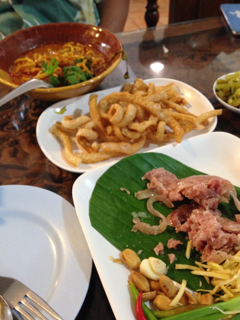 定番のカオソーイ、豚皮の揚げ物、ソーセージの中身みたいな、、?(後で調べたら、ネームという発酵ソーセージでした。豚の赤身と皮と耳が入っています。ビールに合いそう!)もち米を1人前。あと水を1本。二人でなんと200バーツでした。
