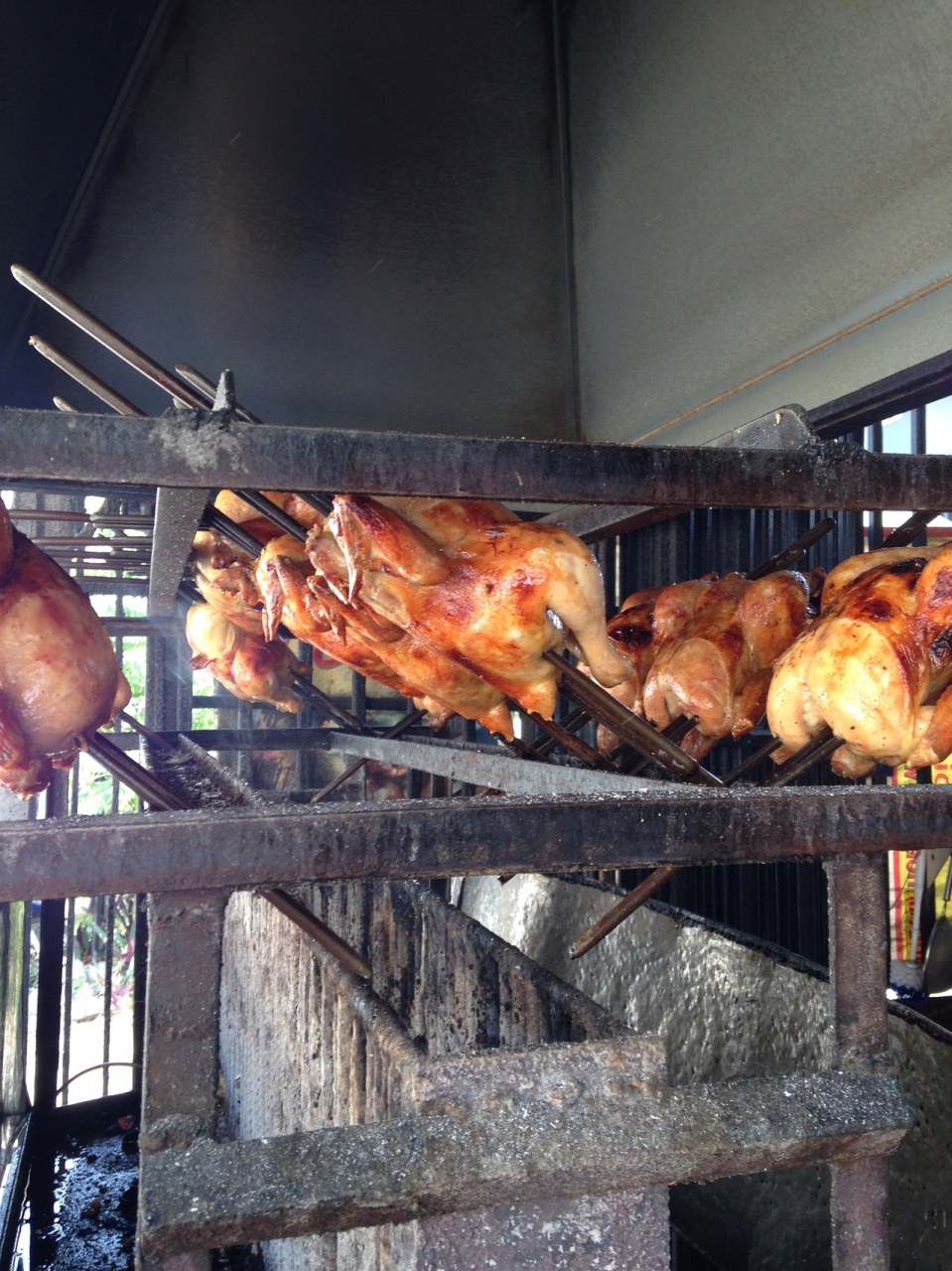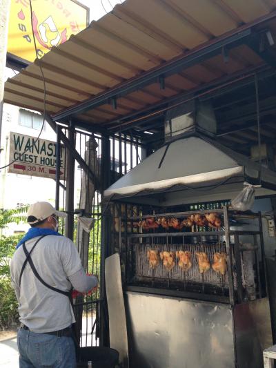 店の前で、たくさんの小ぶりのチキンがクルクル回りながら焼かれていました。