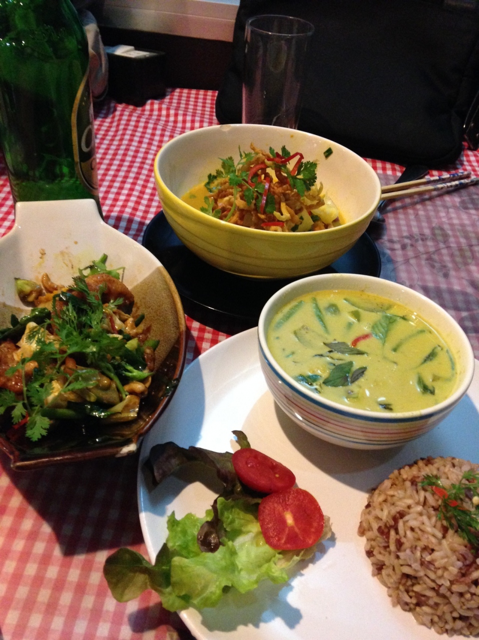 グリーンカレーとブラウンライス、カオソーイ、チキンとカシューナッツの炒め物をいただきました。どれもマイルドな味付けで、観光客には食べやすいと思います。