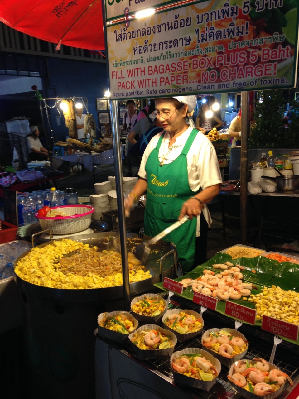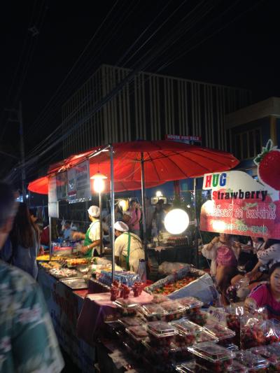 食べ物は、摘み食い程度の屋台はたくさんありますが、ナイトバザールのアヌサン市場の様な落ち着いて食事のできる所は殆どありません。